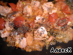 Рыбу нарезать на кубики и добавить к овощам, посолить, поперчить, добавить базилик и всё перемешать, тушить 10-15 минут.