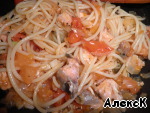 Воду слить, а спагетти отправить в сковородку к рыбе и овощам. Перемешать и оставить всё на 5 минут.