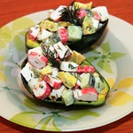 Всё заправляем майонезом, перемешиваем и наполняем половинки авокадо.