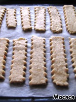 Рабочую поверхность слегка присыпаем мукой и раскатываем тесто не очень тонким слоем. Вырезаем длинные полосочки будущего печенья. Я делаю это с помощью специального ножа, но можно воспользоваться обычными или просто формами для вырубки печенья. Это не принципиально)