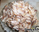 Почистить остывшую рыбу от костей и кожи, кожу легко соскоблить вилкой. Получаются не крупные кусочки рыбы. Вес почищенной рыбы около 1 кг.