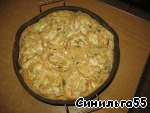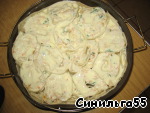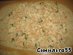 Выкладываем срезом вверх в форму, отрезанную часть лаваша рвем на кусочки и закладываем в свободные места у бортиков и между "розами".