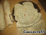 Третий лаваш выкладываем в форму, чтобы оставались бортики, лишнее отрезаем.