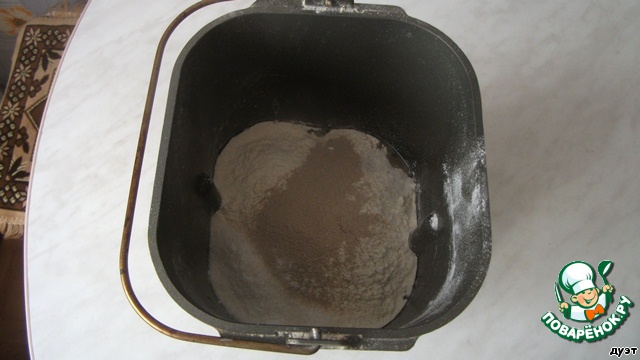 На жидкость всыпать 2,5 стакана муки, в уголок емкости 0,5 ч. л. соли, в другой уголок - 1,5 ст. л сахара, по центру - дрожжи (1,5 ч. л.) |