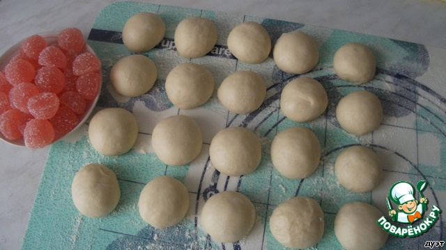 Дать расстояться 10 минут и начинаем делать булочки. Приминаем наш колобок в лепёшечку и в центр кладём мармеладку. |