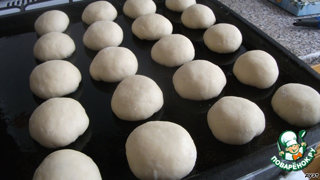 Выкладываем на противень, смазанный растительным маслом и даём расстояться примерно 20 минут, накрыв полотенцем. Разогреваем духовку до 180 гр и выпекаем 20 минут. |