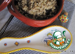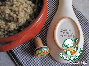 Положить отцеженную крупу и немного обжарить, чтоб масло впиталось в крупу. Влить вино и выпарить.