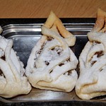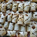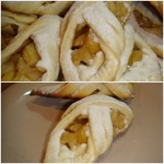 Тесто раскатать и разрезать на равносторонние треугольники (со сторонами примерно 10-11см). На каждом треугольнике сделать надрезы как показано на фото.