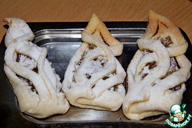 В центр каждого треугольника выложить начинку и загнуть нижние углы.
