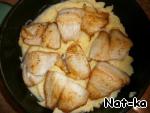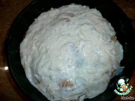 Сверху рыбы выливаем нашу сливочно-луковую "заливку" и посыпаем тертым сыром.