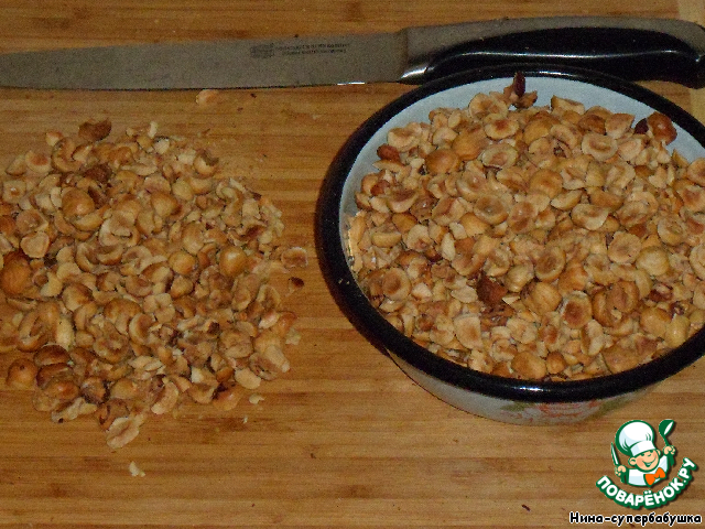 Фундук обжарить в духовке, остудить и крупно порубить.