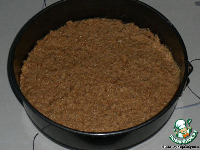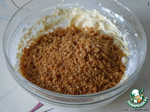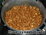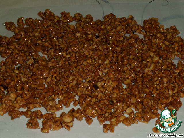 - Орехи (карамелизованные, 8 ст.л. - для нижнего коржа, 8 ст.л. - для средних коржей, с горкой) — 16 ст. л.