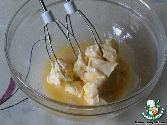 Для нижнего слоя разогреть духовку до 180*С. Дно формы (22 см) выстелить бумагой для выпечки. Желтки взбить с маслом,