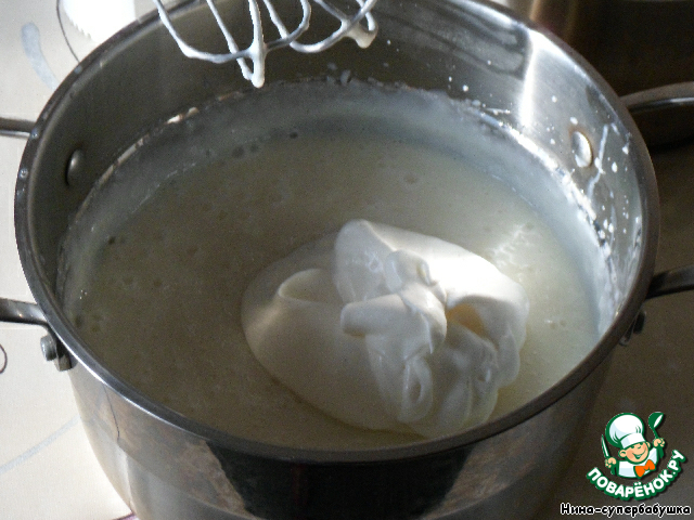 Когда начинка достигнет необходимой консистенции, взбить ее миксером. В отдельной посуде взбить сливки с сахарной пудрой и аккуратно смешать с молочной массой.