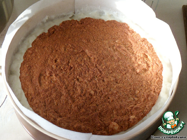 Для сбора торта нужна форма диаметром 24 см, дно и бока которой надо выстелить бумагой для выпечки. На дно положить первый корж, на него 1/3 начинки, затем один из белковых коржей, еще 1/3 начинки, второй белковый корж, оставшуюся начинку. Можно поставить торт в холодильник, а можно убрать на несколько дней в морозилку. Очень удобно готовить такой торт заранее. Если торт предназначается для вечернего чаепития, утром его нужно переставить из морозилки в холодильник, чтобы он полностью разморозился.