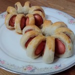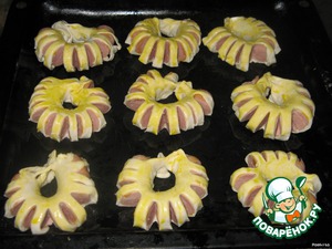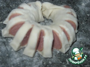 • Разрезать сосиску в тесте поперёк не до конца на несколько частей.