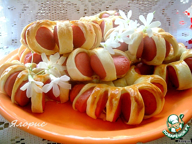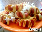 Вкусно и красиво. Видела такую хризантему-ромашку в журнале. Вариант беспроигрышный. Все любят и выпечку,и сосиски) готовила,готовлю и буду готовить)