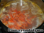 Морковь и сельдерей нарезать соломкой, картофель - брусочками, перец - вдоль на 4-6 частей и поперек тонкими ломтиками. Рис промыть. Морковь и сельдерей спассеровать до полуготовности. |