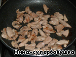 Куриное филе нарезать соломкой и обжарить до золотистого цвета, опустить в кипящий бульон. Огонь убавить до маленького. |