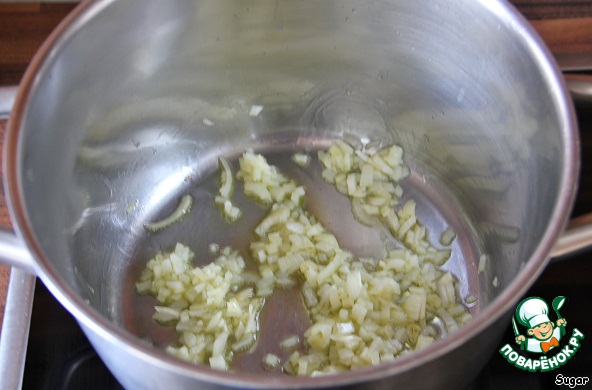 Разогреть оливковое масло и обжарить лук до золотистого цвета.
