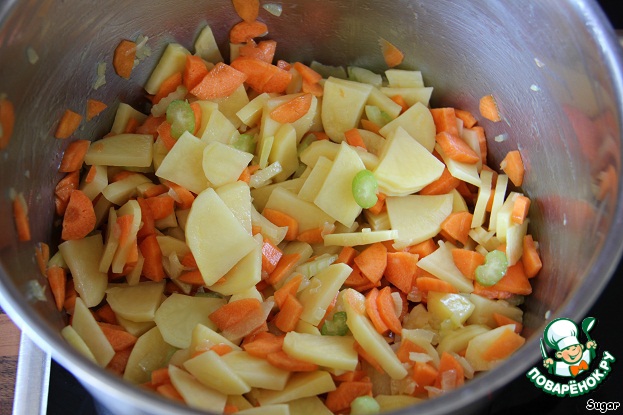 Добавить морковь, сельдерей, картофель. Залить бульоном, посолить, поперчить, добавить специи. У меня были готовые специи, упакованные в мешочке типа чайного. Варить 25-30 мин.