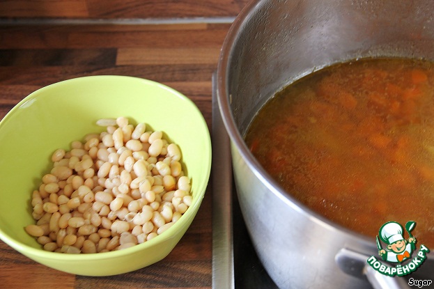Потом добавить белую фасоль, предварительно замоченную на ночь и отваренную. Если фасоль консервированная, тогда перед добавкой в суп просто ее ополоснуть холодной водой.