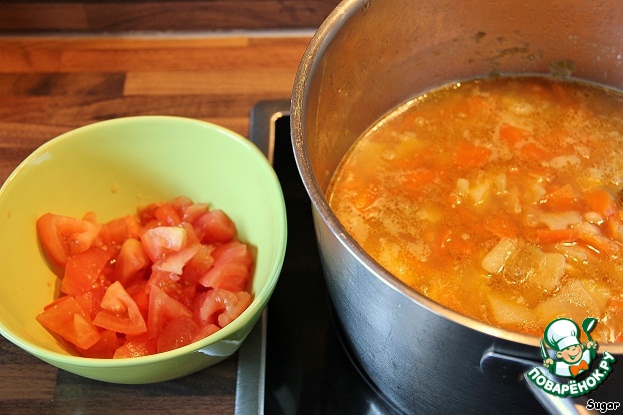 С помидоров снять шкурку, нарезать мелкими кусочками и тоже добавить в суп.