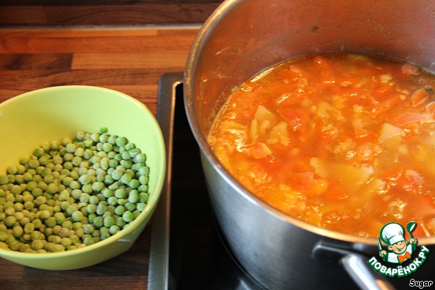 И, наконец, добавить зеленый горошек. Подождать, пока закипит, варить 5 мин. По необходимости можно добавить воды или еще бульона.