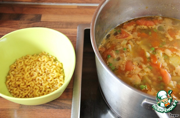 Добавить макароны и варить до их готовности. Хочу оговориться, я в суп положила то количество макарон, что было указанно в оригинальном рецепте, но когда суп был готов, мне показалось, что их многовато. В следующий раз добавлю только половину.