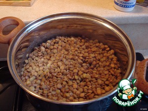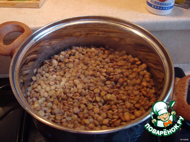 Промываем чечевицу, заливаем холодной водой и ставим на огонь вариться.