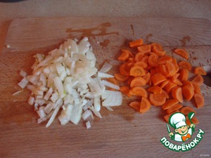 Морковь и лук обжариваем на растительном масле, до полуготовности. Вместе с морковкой и луком в кастрюлю кладем грибы (у меня были мороженые).