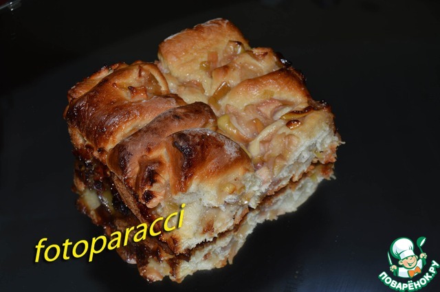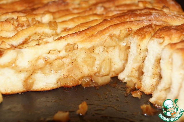 Когда тесто увеличится в объеме не менее, чем в 2 раза, выложить его на стол и раскатать довольно тонко в прямоугольный пласт. Равномерно разложить яблочную начинку. -