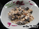 Смешаем овсяные хлопья, сахар, мелко нарезанный черноcлив и орехи (у меня миндаль).
