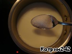 Полученную смесь тонкой струйкой, постоянно помешивая, вылить в горячее молоко. Довести до кипения, на маленьком огне, постоянно помешивая, проварить минуты 2.