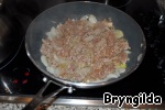 Теперь займемся начинкой. Обжарим на сковороде лук, добавим фарш,