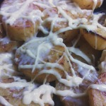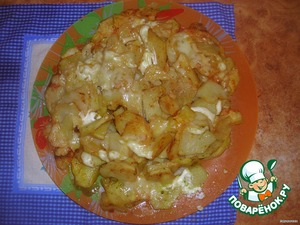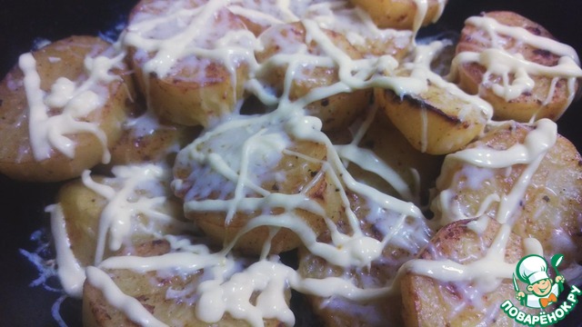 Выложить картофель на плоское большое блюдо, сверху полить майонезом, положить несколько пластиков сыра.