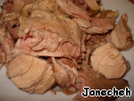 Снимаем мясо с костей, разрывая его на небольшие кусочки.