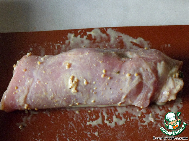 Мясо посыпать солью и перцем, щедро смазать маринадом и сложить стопочкой в миске. Сверху вылить оставшийся маринад. Накрыть пленкой и оставить мариноваться. Я готовила с вечера. -