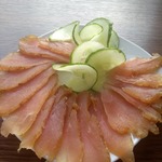 Нарезка по внешнему виду весьма напоминала красную рыбку. И совсем уж для эксперимента - довела часть нарезочки до большего сходства, вспомнив, что в холодильнике в баночке стоит жирок от копченой семги (ну оочень жирненькая была, вот я его и слила в маленькую баночку для будущих кулинарных изысканий). Так вот этим жирком и смазала постную индюшачью нарезку. Ну что сказать, получилась шикарная такая красная рыба. Можно теперь запросто вводить людей в заблуждение