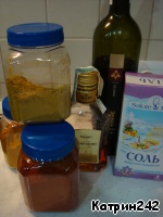 Использовала приправы - перец черный, паприку, чили, гвоздику, мускатный орех, бадьян. После того, как мясо просолилось, было обмыто и обсушено, снова натерла его этими специями.