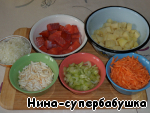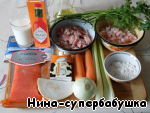 Картофель, морковь и лук очистить. Лук измельчить, картофель и морковь нарезать маленькики кубиками. Сельдерей нарезать: корневой - соломкой, черешковый - ломтиками. Бекон нарезать полосками. Филе форели нарезать крупными кубиками.