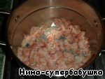 Всыпать картофель и варить 5 минут. Посолить. Добавить в суп филе форели и креветки и варить еще 4 минуты.