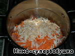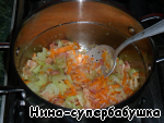 всыпать морковь и корневой сельдерей и обжаривать на среднем огне, все время помешивая, 10 минут.