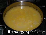 Помешивая, влить в кастрюлю 2 литра горячего бульона или воды, дать закипеть.