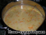 В сотейнике смешать молоко и сливки, довести до кипения и влить в суп. Добавить соус табаско, прокипятить 1 минуту и выключить огонь. С соусом будьте осторожны, сразу весь не кладите, добавляйте по частям и пробуйте. Я положила сразу весь и суп был очень острый.