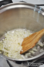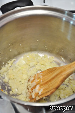 В кастрюле с толстым дном на оливковом масле слегка обжарить нарубленный репчатый лук и чеснок.