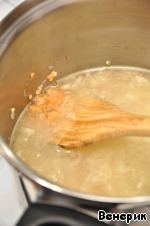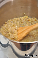 Положить 200г промытой красной чечевицы, влить 750 мл бульона
