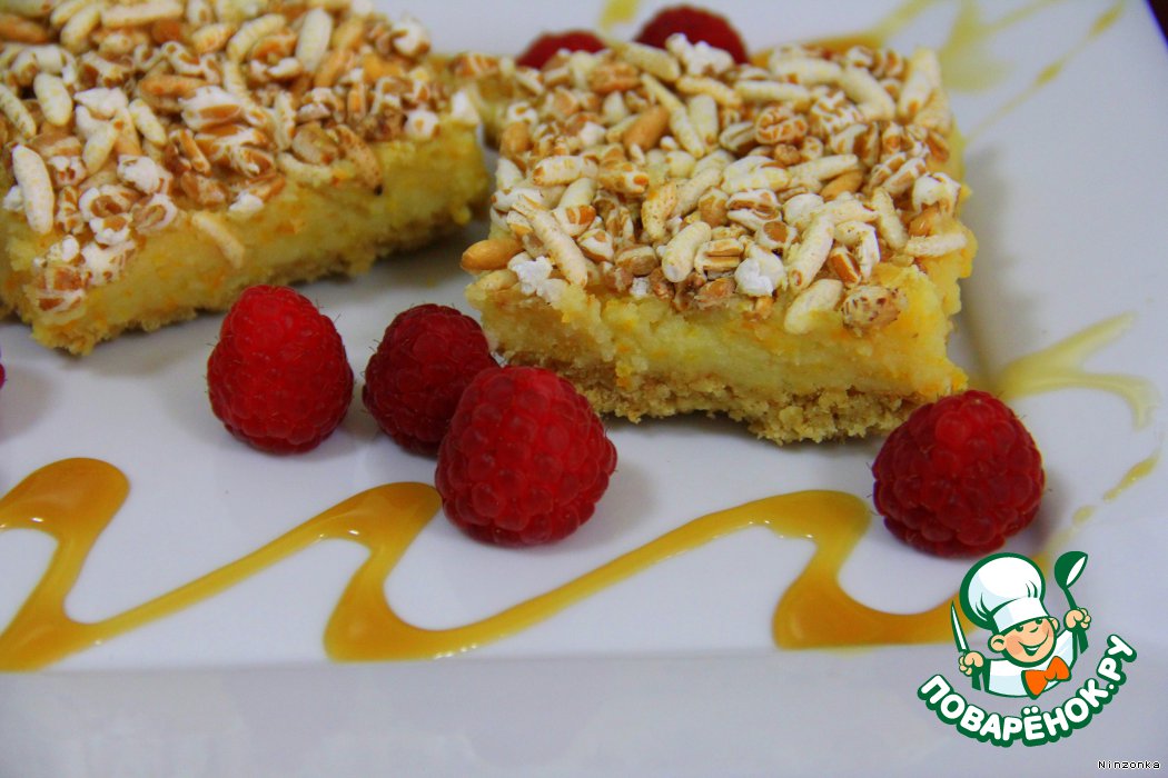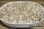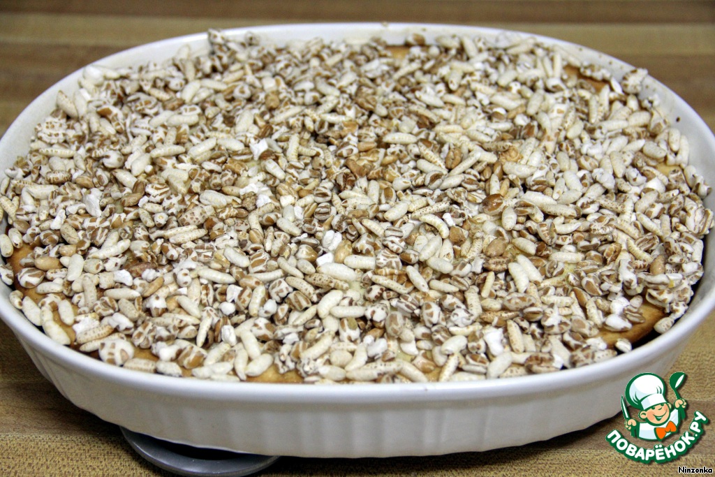 На готовый пирог сверху насыпаем злаковые хлопья и слегка прижимаем. Накрываем пирог и даем ему остыть. |