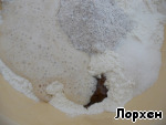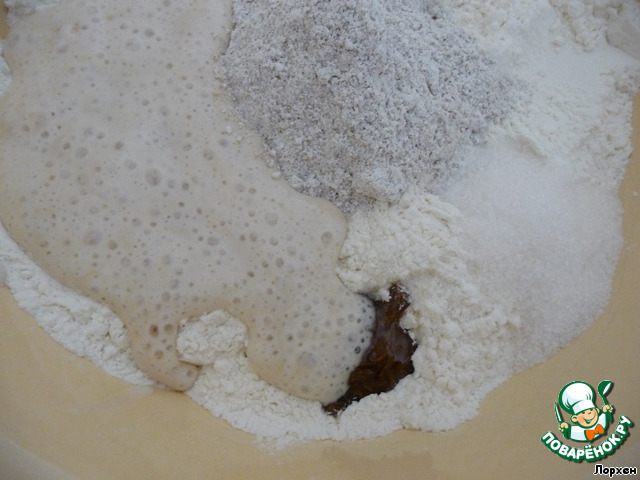 Приготовить опару: 3 ст. ложки муки и дрожжи разведите теплой водой (около 4 ст. ложек) до консистенции сметаны.