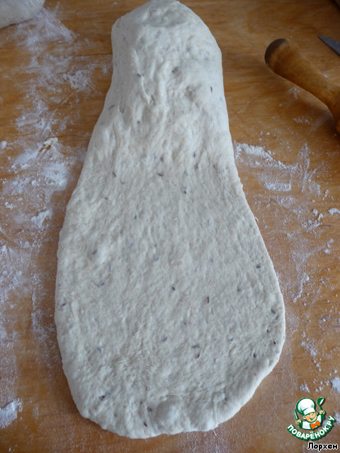 Батон визуально разделите на 2 части, одну часть скалкой раскатайте в лепёшку.